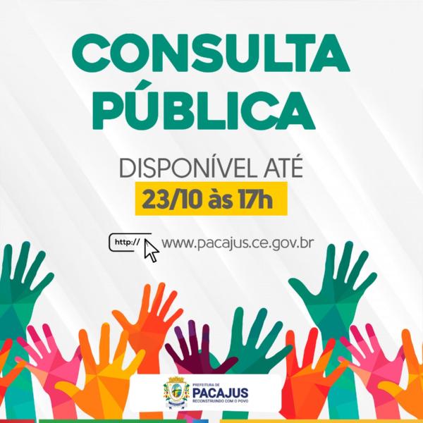 A prefeitura de Pacajus, através da Secretaria de Infraestrutura e Desenvolvimento Urbano está realizando a Consulta Pública do programa com a Companhia de Água e Esgoto do Estado do Ceará relativo aos serviços de abastecimento de água, coleta, transporte, tratamento e destino final de esgotos sanitários nas localidades urbanas da Sede do Município. A consulta ficará disponível no site da prefeitura até o dia 23 de outubro. Colabore e participe!